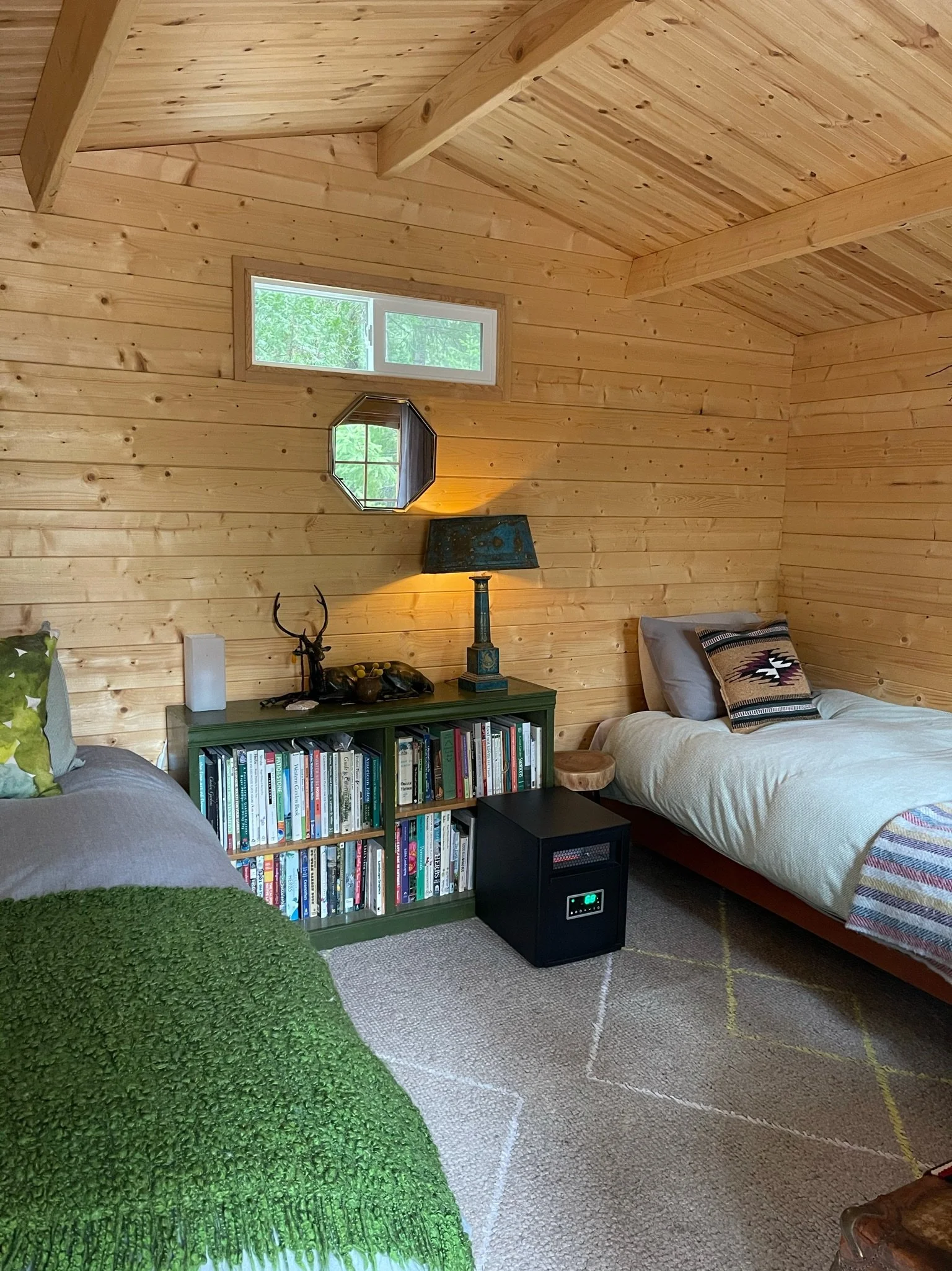 There are three options for accommodations; either shared rooms with shared bath in the main house, with living room and kitchen, shared cabins or glamping in a shared belle tent in the yard with shared outdoor bath. All accommodations are simple, shared and very comfortable. We have only one tent space left, and it’s for a man.